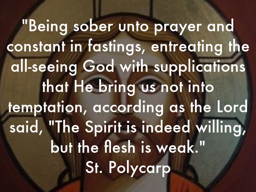 "Being sober unto prayer and constant in fastings, entreating the all-seeing God with supplications that He bring us not into temptation, according as the Lord said, "The Spirit is indeed willing, but the flesh is weak."