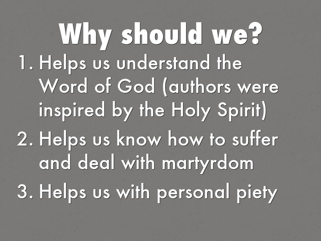 - Helps us understand the Word of God (authors were inspired by the Holy Spirit)