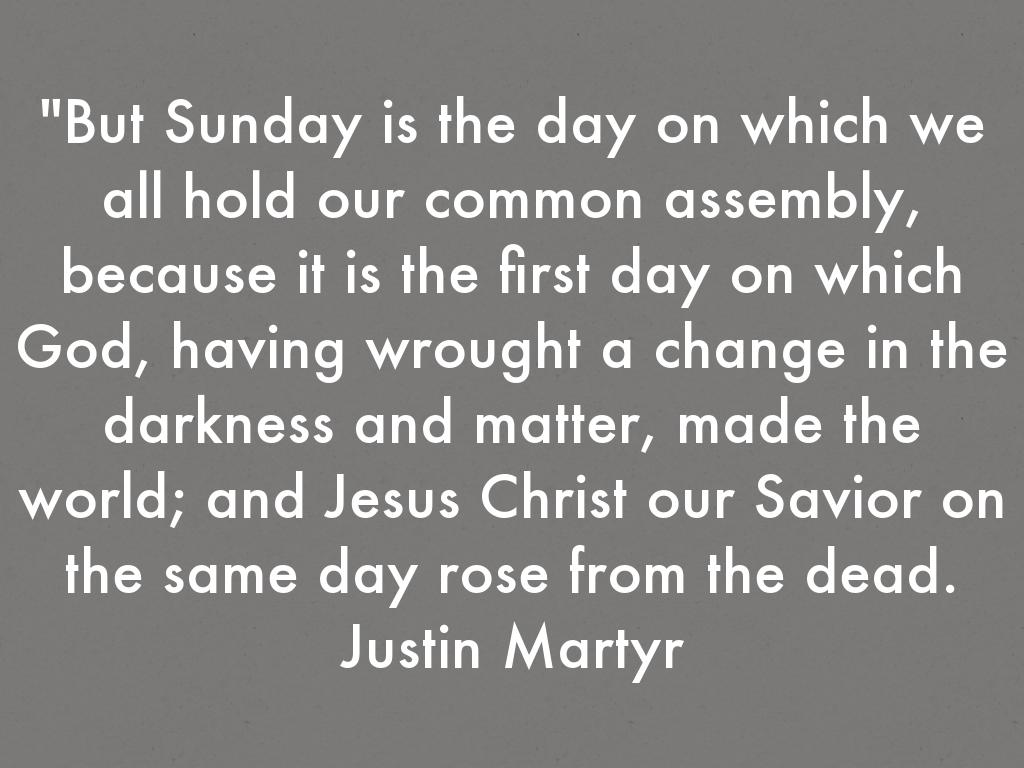 "But Sunday is the day on which we all hold our common assembly, because it is the first day on which God, having wrought a change in the darkness and matter, made the world; and Jesus Christ our Savior on the same day rose from the dead."