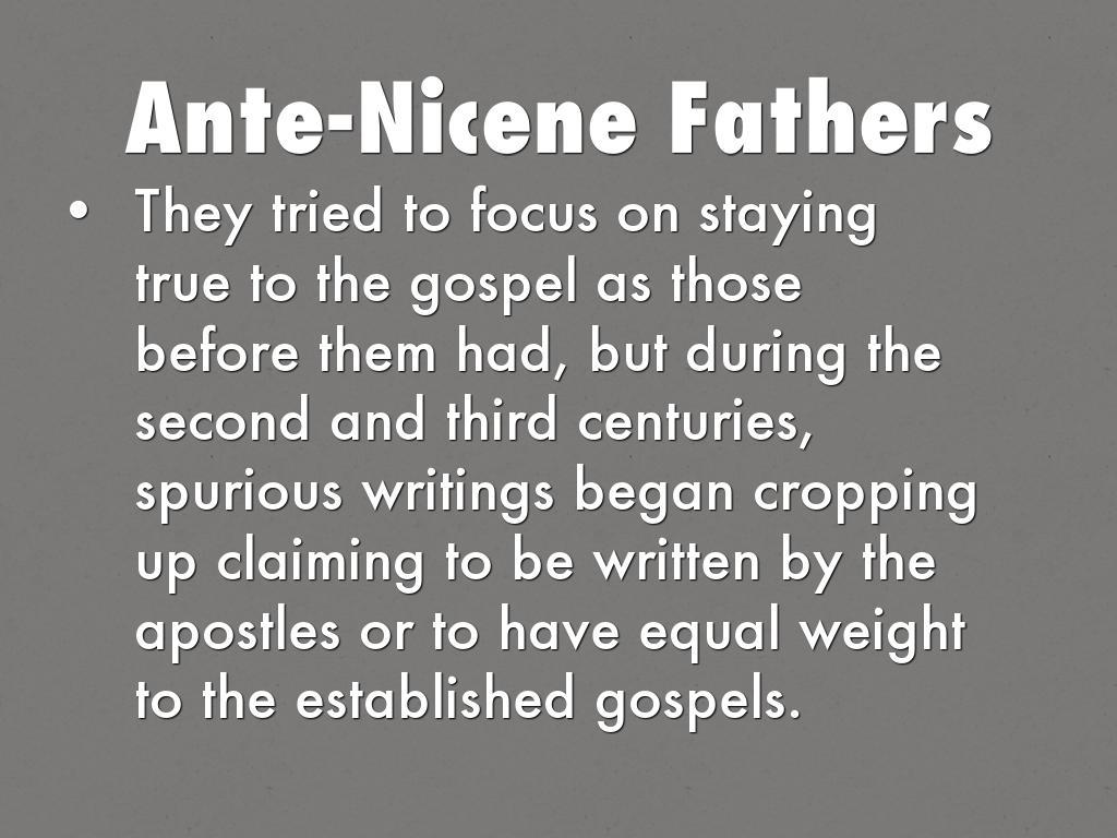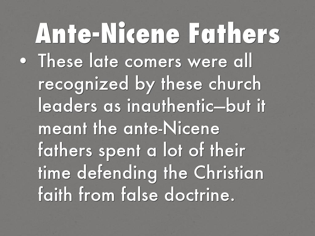 - These late comers were all recognized by these church leaders as inauthentic—but it meant the ante-Nicene fathers spent a lot of their time defending the Christian faith from false doctrine.