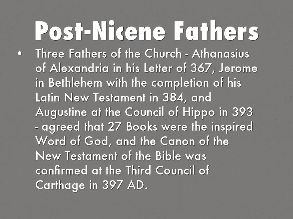 - Three Fathers of the Church - Athanasius of Alexandria in his Letter of 367, Jerome in Bethlehem with the completion of his Latin New Testament in 384, and Augustine at the Council of Hippo in 393 - agreed that 27 Books were the inspired Word of God, and the Canon of the New Testament of the Bible was confirmed at the Third Council of Carthage in 397 AD.
