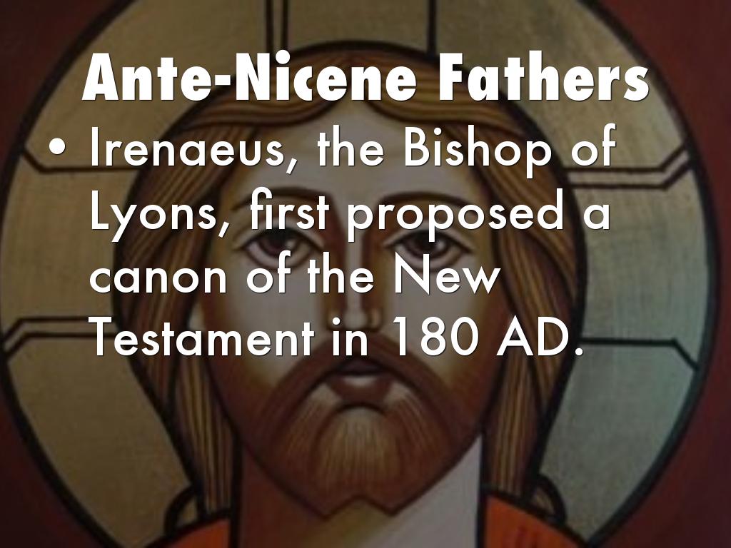 - Irenaeus, the Bishop of Lyons, first proposed a canon of the New Testament in 180 AD.