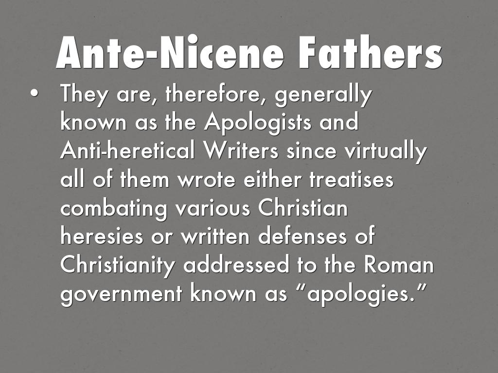 - They are, therefore, generally known as the Apologists and Anti-heretical Writers since virtually all of them wrote either treatises combating various Christian heresies or written defenses of Christianity addressed to the Roman government known as “apologies.”