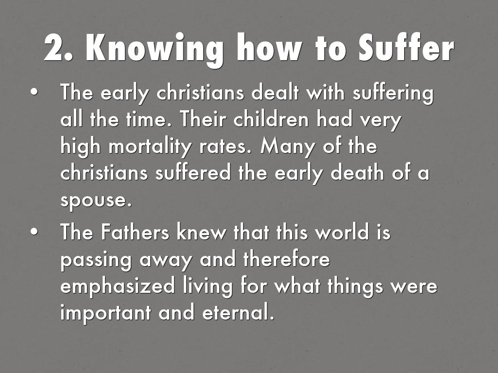 - The early christians dealt with suffering all the time. Their children had very high mortality rates. Many of the christians suffered the early death of a spouse.