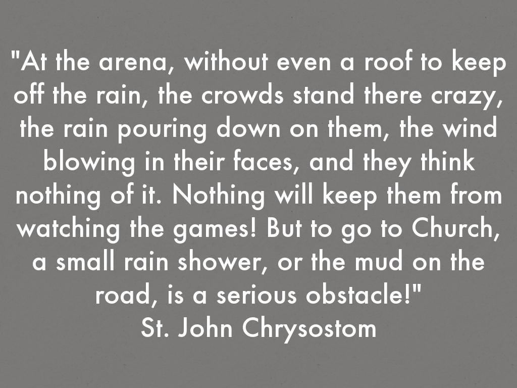 "At the arena, without even a roof to keep off the rain, the crowds stand there crazy, the rain pouring down on them, the wind blowing in their faces, and they think nothing of it. Nothing will keep them from watching the games! But to go to Church, a small rain shower, or the mud on the road, is a serious obstacle!"
