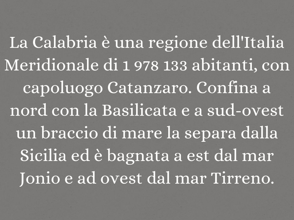 La Calabria è una regione dell'Italia Meridionale di 1 978 133 abitanti, con capoluogo Catanzaro. Confina a nord con la Basilicata e a sud-ovest un braccio di mare la separa dalla Sicilia ed è bagnata a est dal mar Jonio e ad ovest dal mar Tirreno.