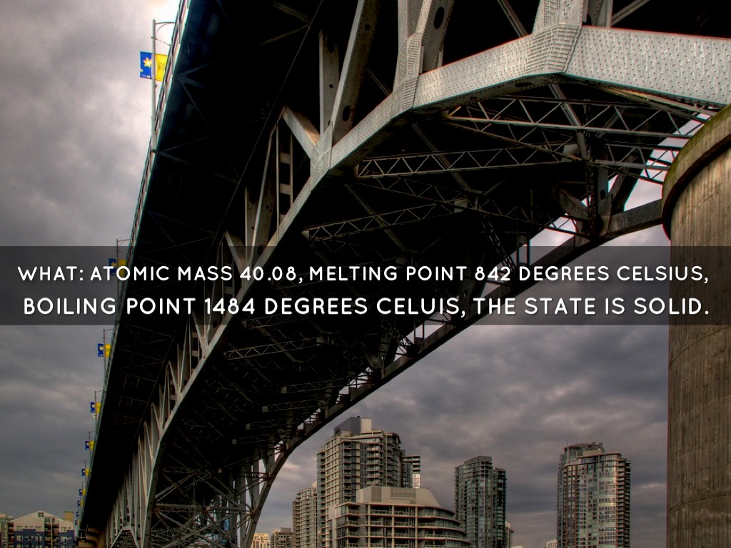 WHAT: ATOMIC MASS 40.08, MELTING POINT 842 DEGREES CELSIUS,