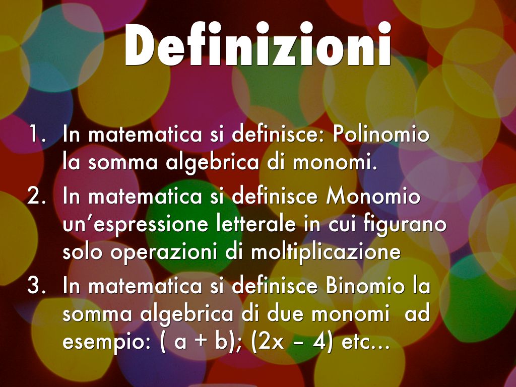 • In matematica si definisce: Polinomio la somma algebrica di monomi.