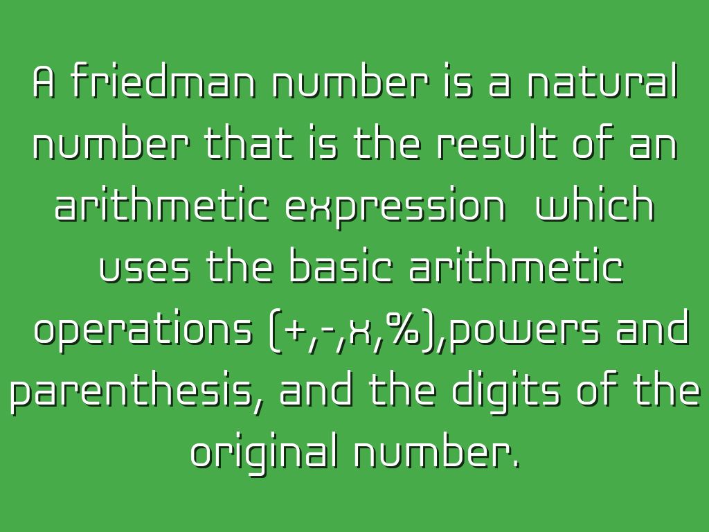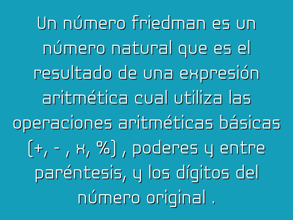 Un número friedman es un número natural que es el resultado de una expresión aritmética cual utiliza las operaciones aritméticas básicas (+, - , x, %) , poderes y entre paréntesis, y los dígitos del número original .