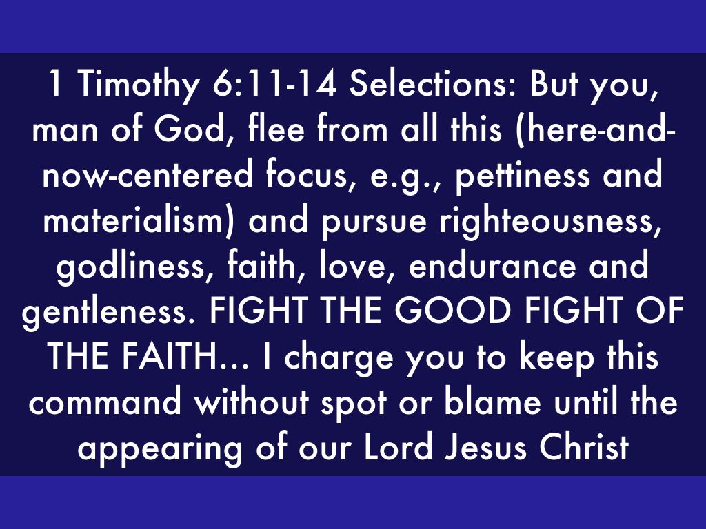 1 Timothy 6:11-14 Selections: But you, man of God, flee from all this (here-and-now-centered focus, e.g., pettiness and materialism) and pursue righteousness, godliness, faith, love, endurance and gentleness. FIGHT THE GOOD FIGHT OF THE FAITH... I charge you to keep this command without spot or blame until the appearing of our Lord Jesus Christ