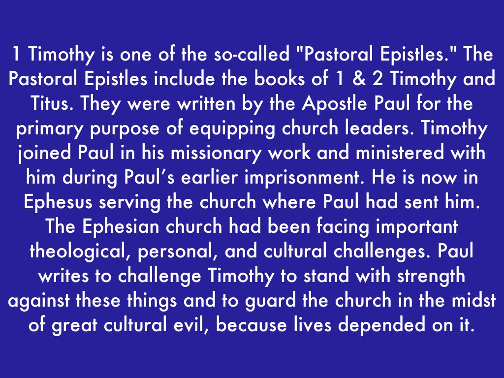 1 Timothy is one of the so-called "Pastoral Epistles." The Pastoral Epistles include the books of 1 & 2 Timothy and Titus. They were written by the Apostle Paul for the primary purpose of equipping church leaders. Timothy joined Paul in his missionary work and ministered with him during Paul’s earlier imprisonment. He is now in Ephesus serving the church where Paul had sent him. The Ephesian church had been facing important theological, personal, and cultural challenges. Paul writes to challenge Timothy to stand with strength against these things and to guard the church in the midst of great cultural evil, because lives depended on it.