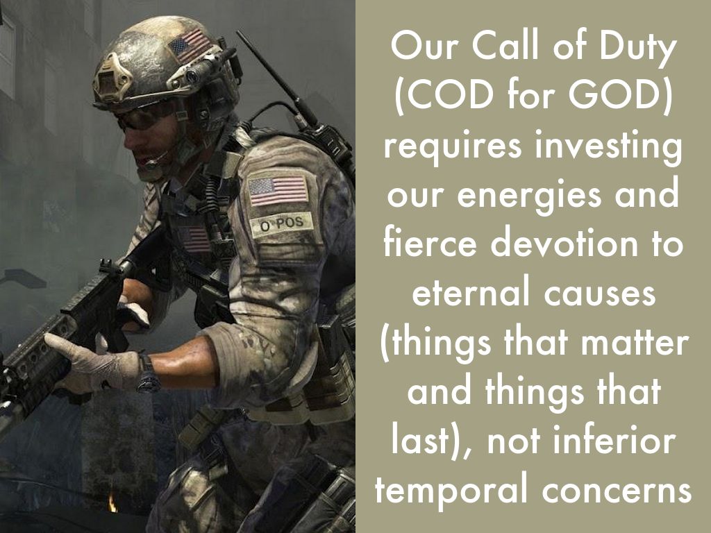 Our Call of Duty (COD for GOD) requires investing our energies and fierce devotion to eternal causes (things that matter and things that last), not inferior temporal concerns