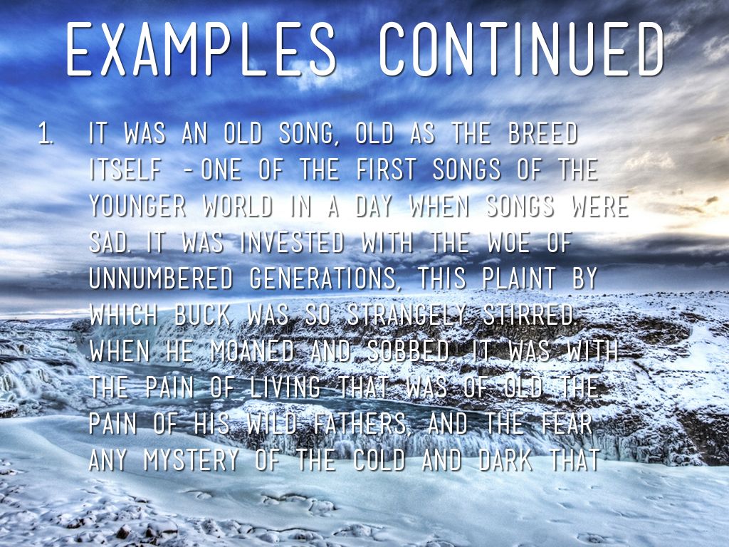 Example "Where upon the old wolf sat down, pointed nose at the moon and broke out in a long wolf howl. The others sat down and howled. And now the call came to Buck in unmistakeable accents."pg.108