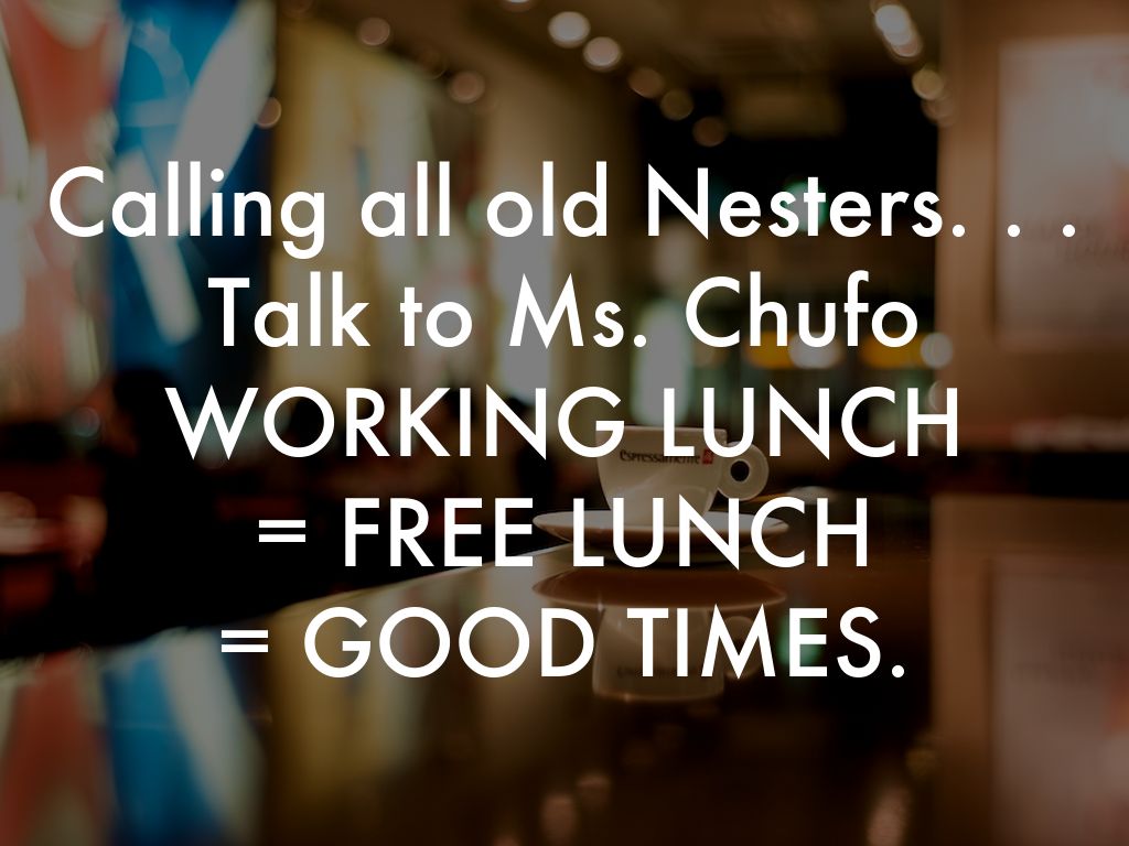 Calling all old Nesters. . . Talk to Ms. Chufo WORKING LUNCH = FREE LUNCH = GOOD TIMES.