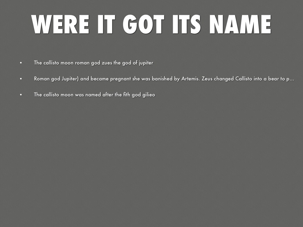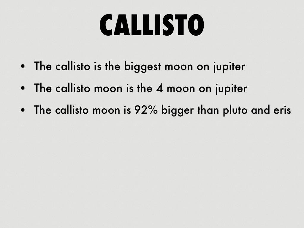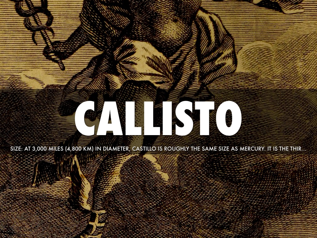 SIZE: AT 3,000 MILES (4,800 KM) IN DIAMETER, CASTILLO IS ROUGHLY THE SAME SIZE AS MERCURY. IT IS THE THIRD LARGEST MOON IN THE ENTIRE SOLAR SYSTEM. IT HAS THE LOWEST DENSITY OF THE FOUR GALILEAN MOONS.CALLISTO