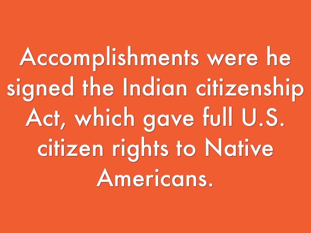Accomplishments were he signed the Indian citizenship Act, which gave full U.S. citizen rights to Native Americans.