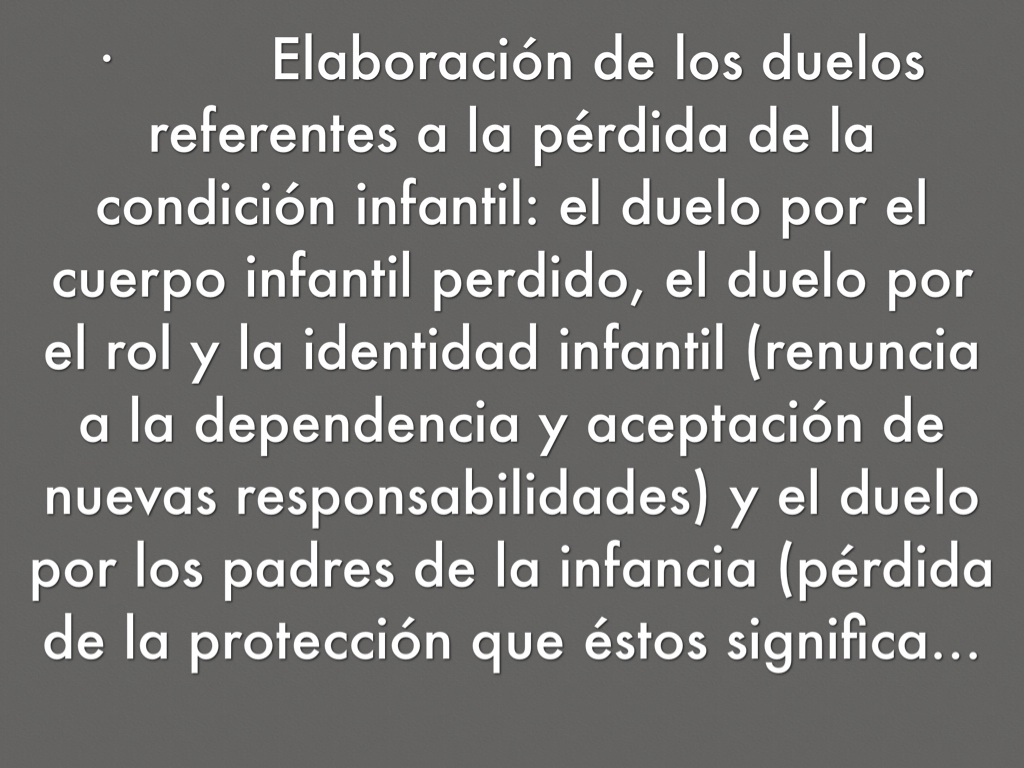 · Elaboración de los duelos referentes a la pérdida de la condición infantil: el duelo por el cuerpo infantil perdido, el duelo por el rol y la identidad infantil (renuncia a la dependencia y aceptación de nuevas responsabilidades) y el duelo por los padres de la infancia (pérdida de la protección que éstos significan).
