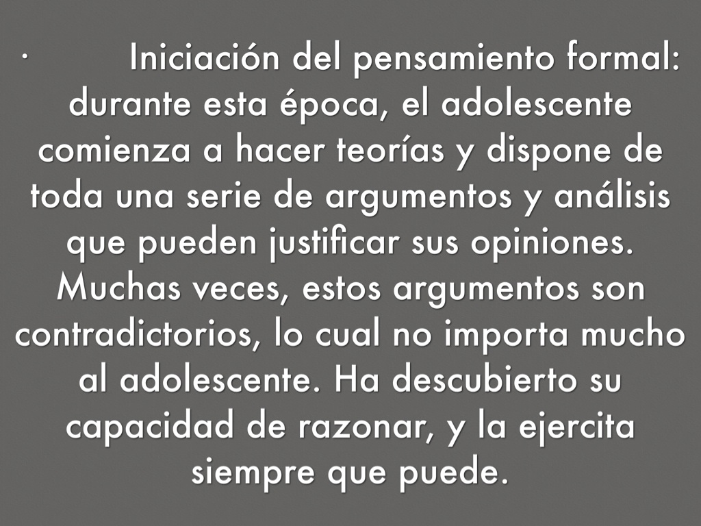 · Iniciación del pensamiento formal: durante esta época, el adolescente comienza a hacer teorías y dispone de toda una serie de argumentos y análisis que pueden justificar sus opiniones. Muchas veces, estos argumentos son contradictorios, lo cual no importa mucho al adolescente. Ha descubierto su capacidad de razonar, y la ejercita siempre que puede.