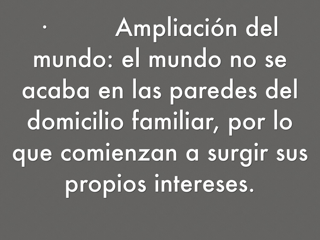 · Ampliación del mundo: el mundo no se acaba en las paredes del domicilio familiar, por lo que comienzan a surgir sus propios intereses.