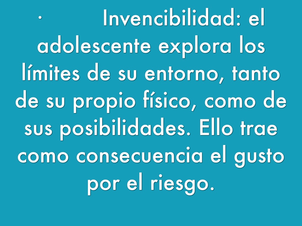 · Invencibilidad: el adolescente explora los límites de su entorno, tanto de su propio físico, como de sus posibilidades. Ello trae como consecuencia el gusto por el riesgo.