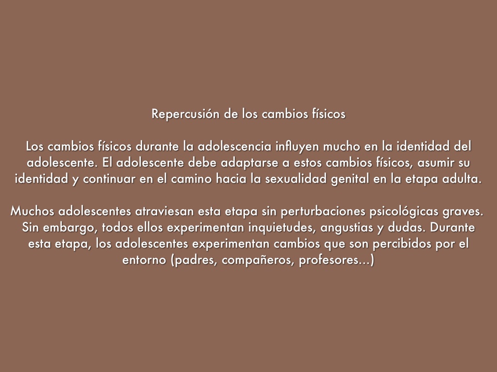 Los cambios físicos durante la adolescencia influyen mucho en la identidad del adolescente. El adolescente debe adaptarse a estos cambios físicos, asumir su identidad y continuar en el camino hacia la sexualidad genital en la etapa adulta.