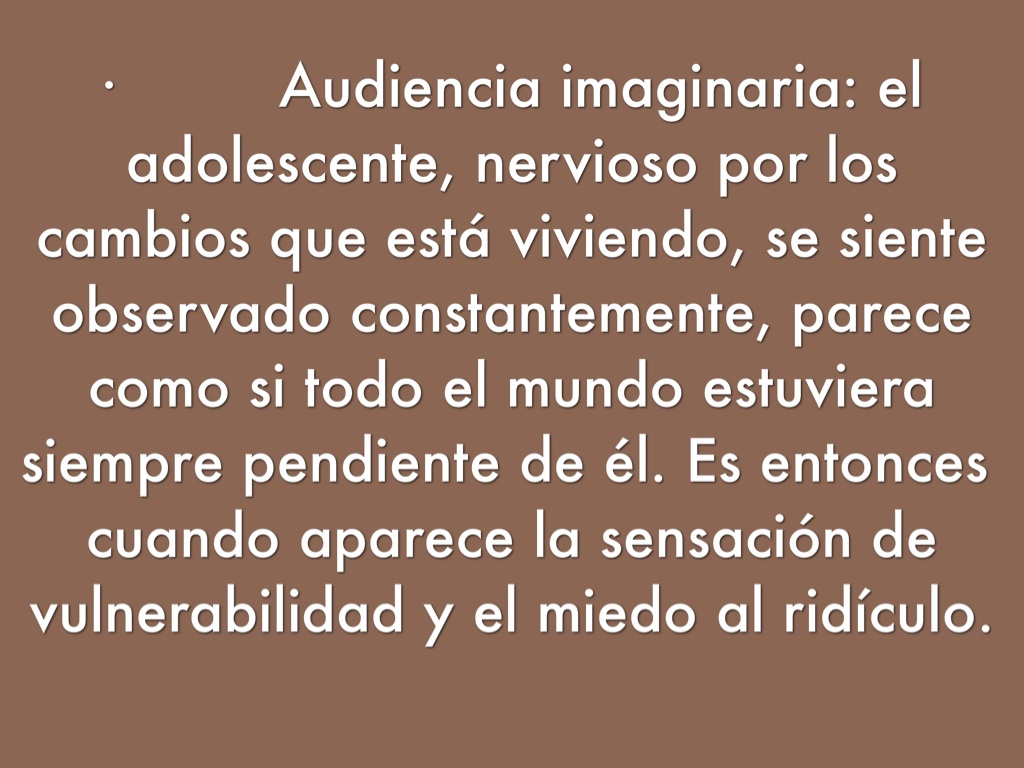 · Audiencia imaginaria: el adolescente, nervioso por los cambios que está viviendo, se siente observado constantemente, parece como si todo el mundo estuviera siempre pendiente de él. Es entonces cuando aparece la sensación de vulnerabilidad y el miedo al ridículo.