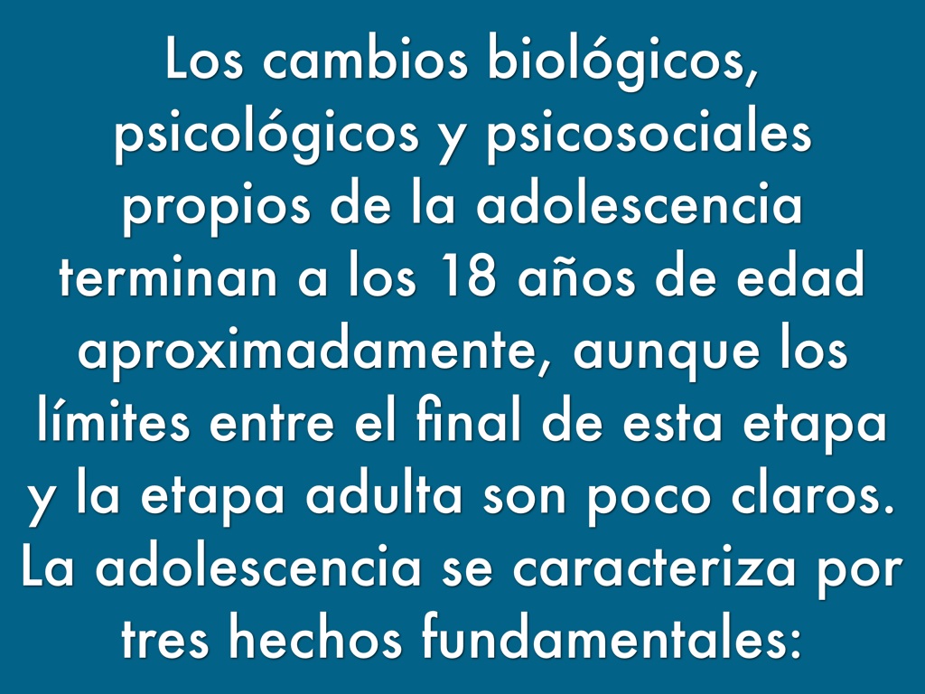 Los cambios biológicos, psicológicos y psicosociales propios de la adolescencia terminan a los 18 años de edad aproximadamente, aunque los límites entre el final de esta etapa y la etapa adulta son poco claros. La adolescencia se caracteriza por tres hechos fundamentales: