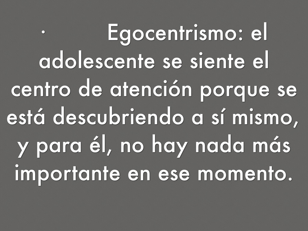 · Egocentrismo: el adolescente se siente el centro de atención porque se está descubriendo a sí mismo, y para él, no hay nada más importante en ese momento.