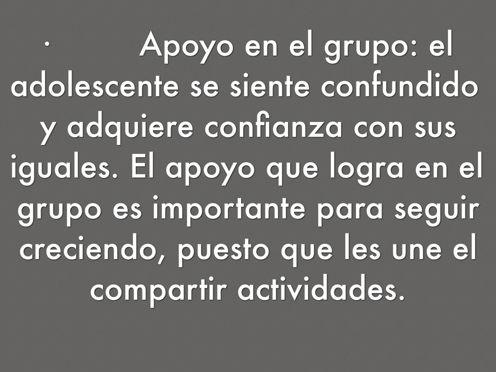 · Apoyo en el grupo: el adolescente se siente confundido y adquiere confianza con sus iguales. El apoyo que logra en el grupo es importante para seguir creciendo, puesto que les une el compartir actividades.
