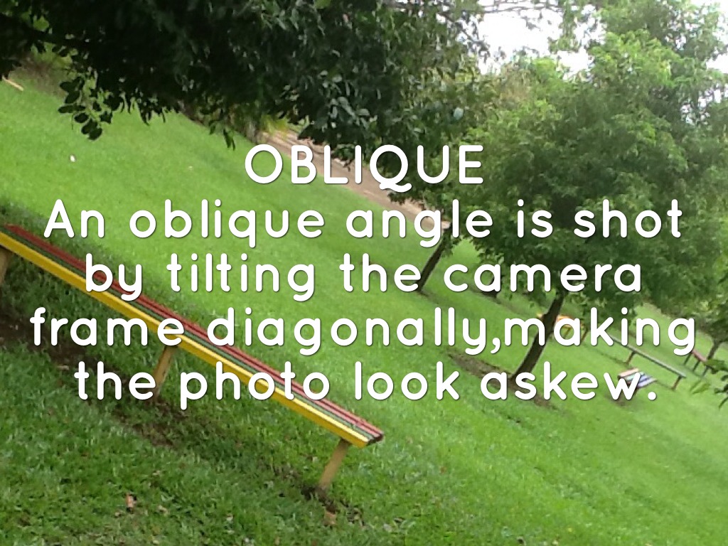 An oblique angle is shot by tilting the camera frame diagonally,making the photo look askew.