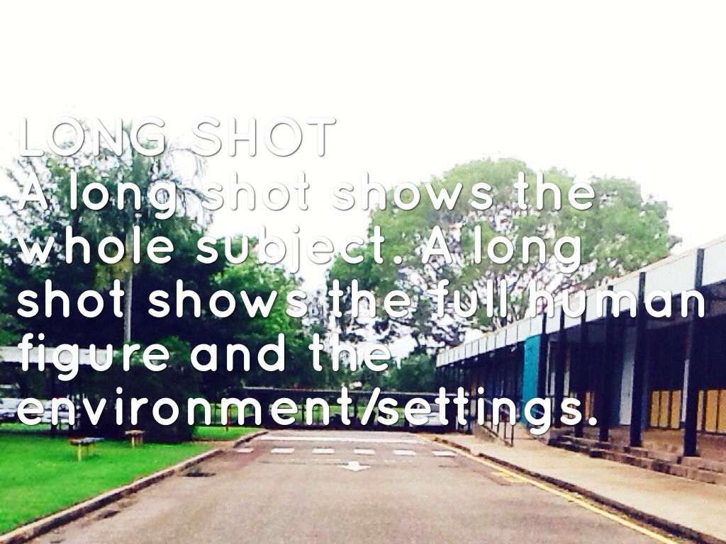 A long shot shows the whole subject. A long shot shows the full human figure and the environment/settings.