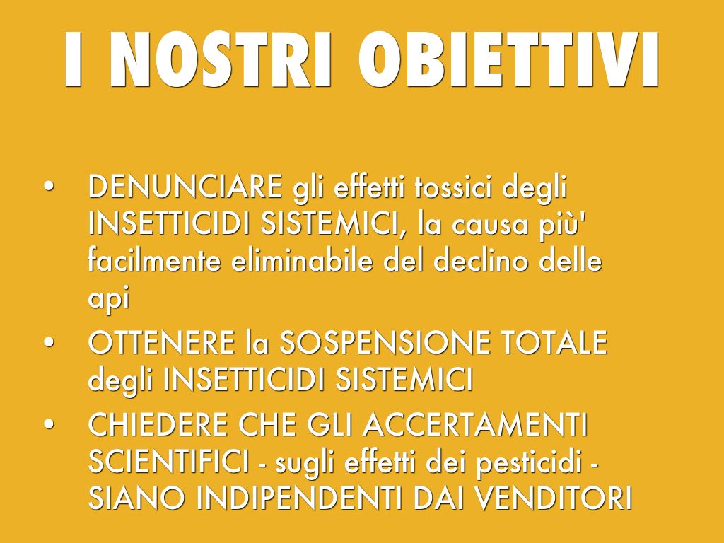 - DENUNCIARE gli effetti tossici degli INSETTICIDI SISTEMICI, la causa più' facilmente eliminabile del declino delle api
