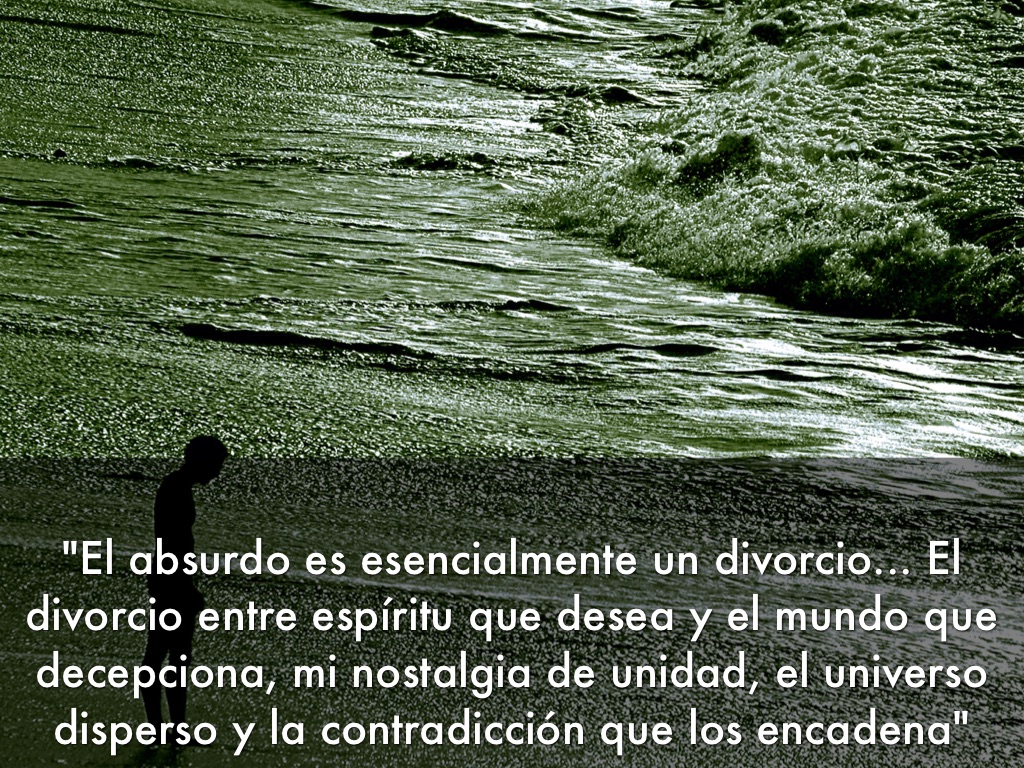 "El absurdo es esencialmente un divorcio... El divorcio entre espíritu que desea y el mundo que decepciona, mi nostalgia de unidad, el universo disperso y la contradicción que los encadena"