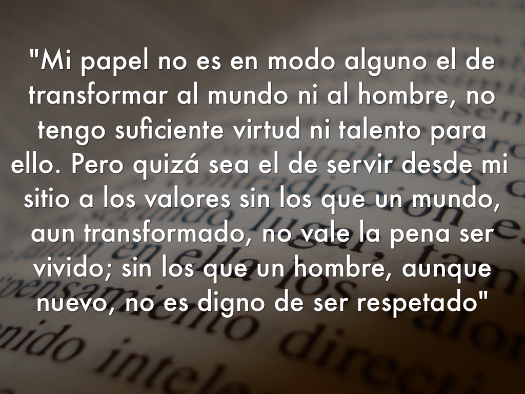 "Mi papel no es en modo alguno el de transformar al mundo ni al hombre, no tengo suficiente virtud ni talento para ello. Pero quizá sea el de servir desde mi sitio a los valores sin los que un mundo, aun transformado, no vale la pena ser vivido; sin los que un hombre, aunque nuevo, no es digno de ser respetado"