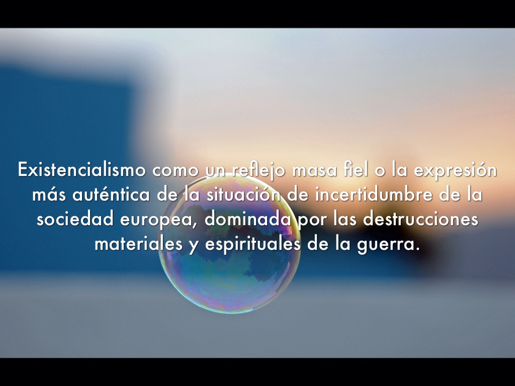 Existencialismo como un reflejo masa fiel o la expresión más auténtica de la situación de incertidumbre de la sociedad europea, dominada por las destrucciones materiales y espirituales de la guerra.