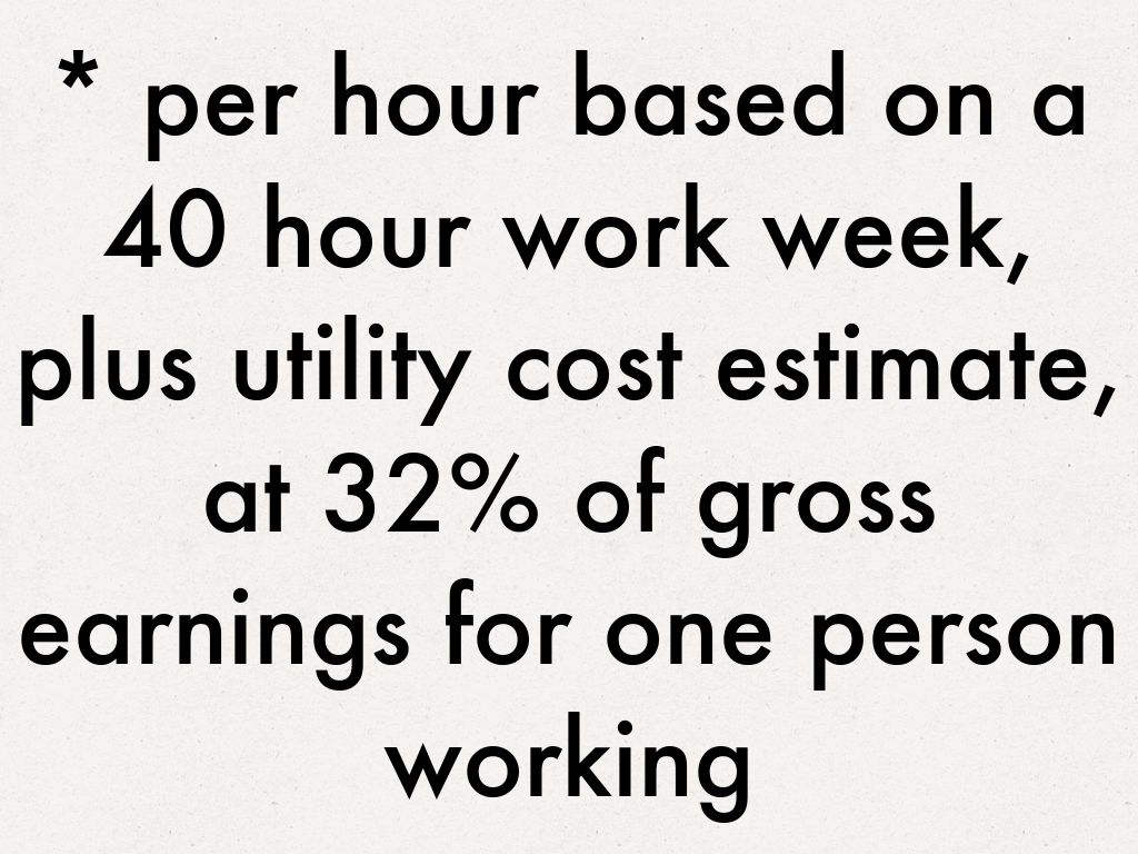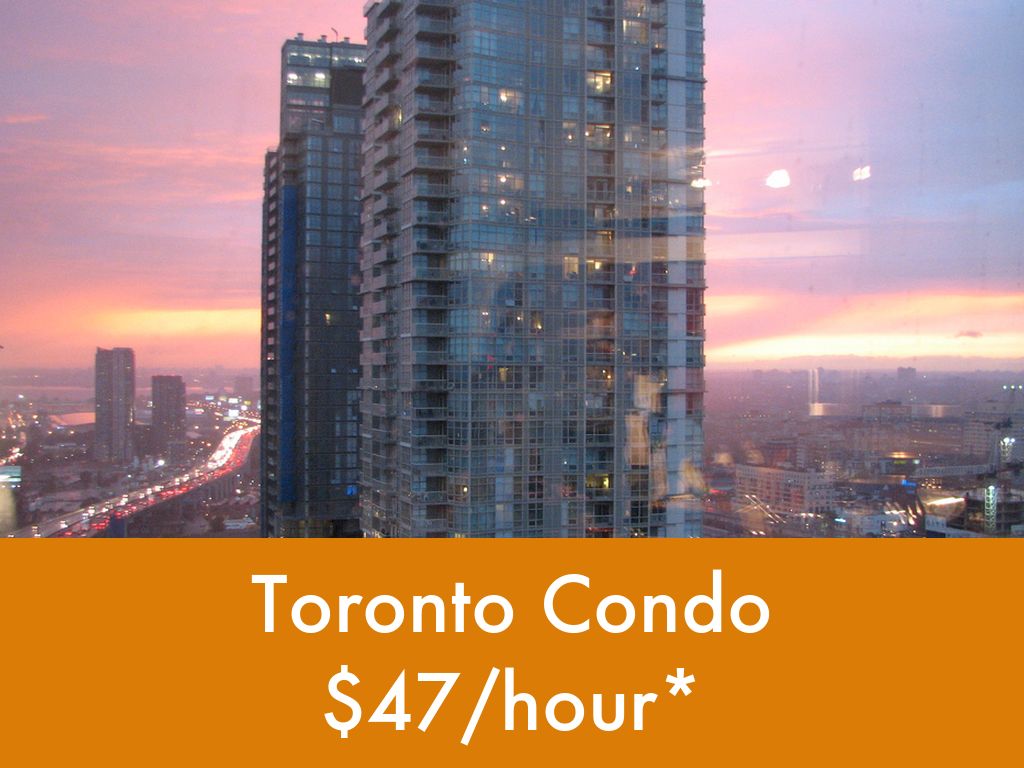 * $58 per hour for high rise condo home with 2 bedrooms in the downtown Toronto core. Based on a 40 hour work week, plus utility cost estimate, at 32% of gross earnings for one person working.