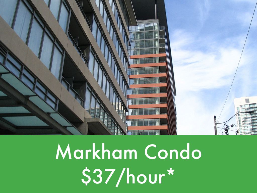 * $37 per hour for high rise condo home with 2 bedrooms in Markham. Based on a 40 hour work week, plus utility cost estimate, at 32% of gross earnings for one person working.