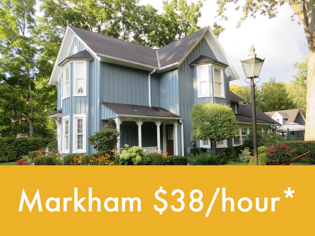 * $38 per hour for non high rise condo home with 3 bedrooms in Markham. Based on a 40 hour work week, plus utility cost estimate, at 32% of gross earnings for one person working.