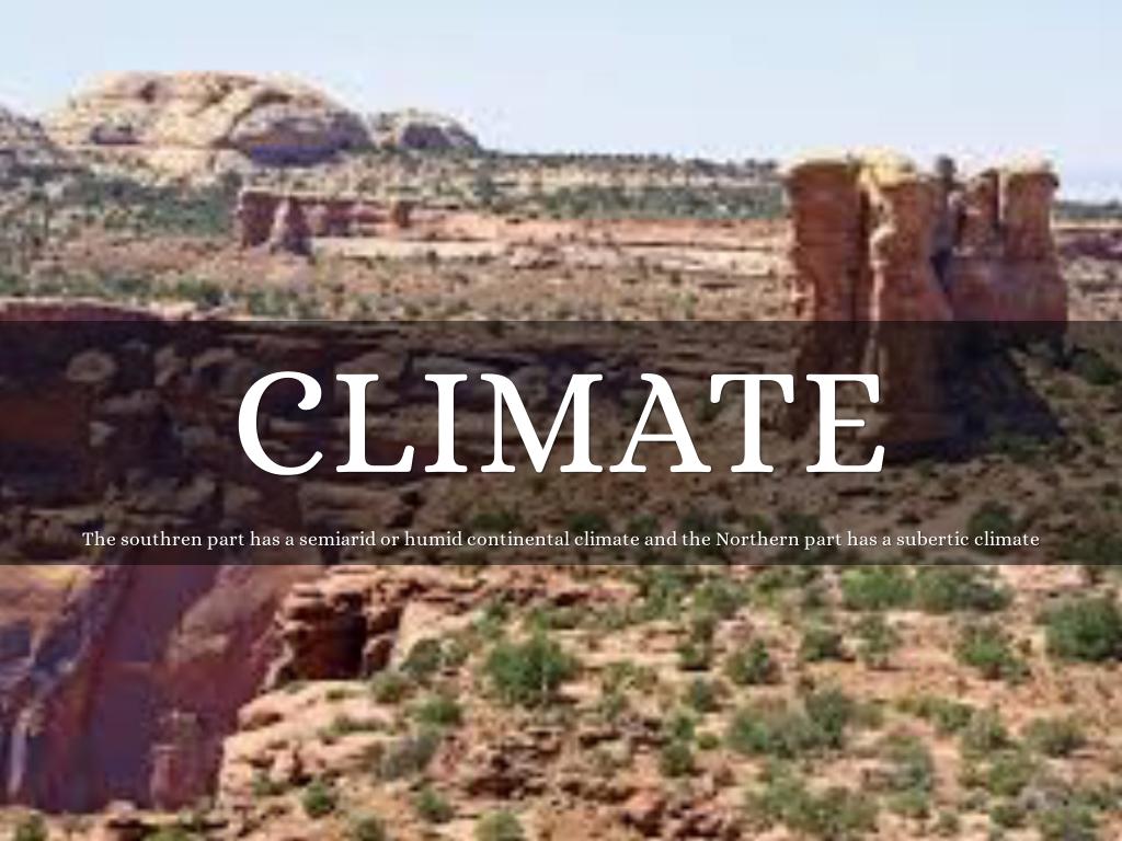 The southren part has a semiarid or humid continental climate and the Northern part has a subertic climate