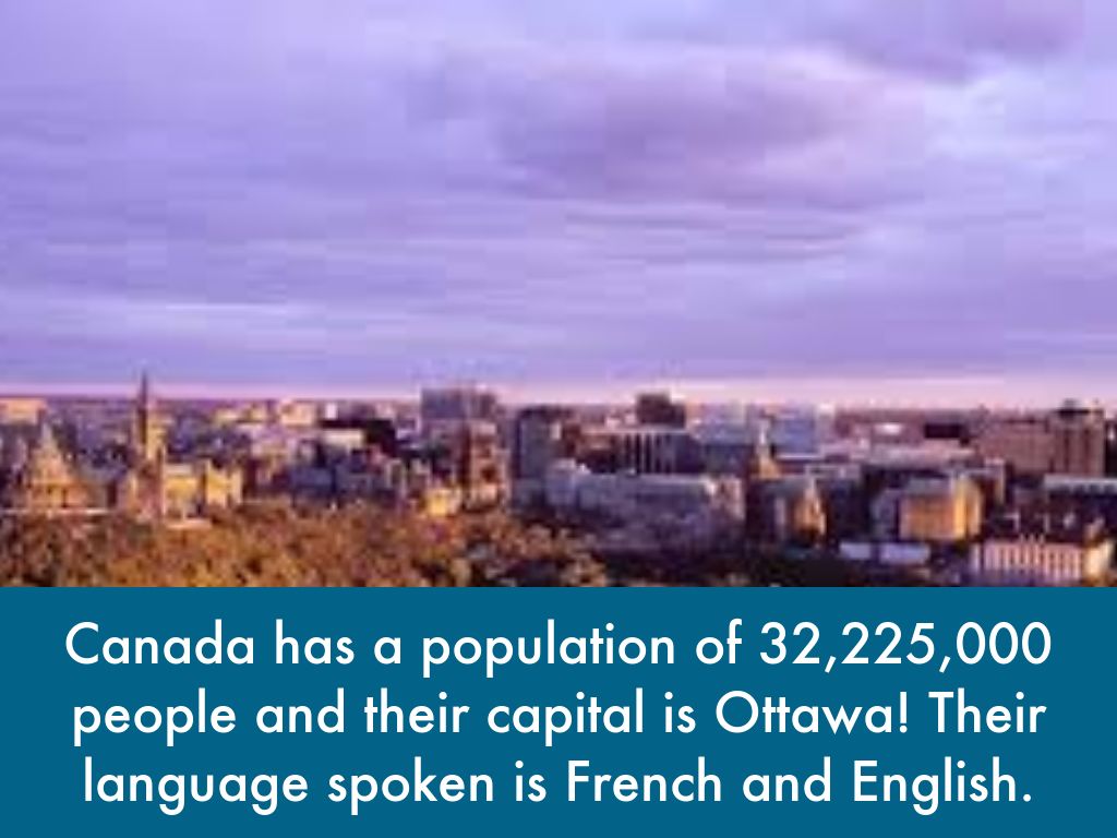 Canada has a population of 32,225,000 people and their capital is Ottawa! Their language spoken is French and English.