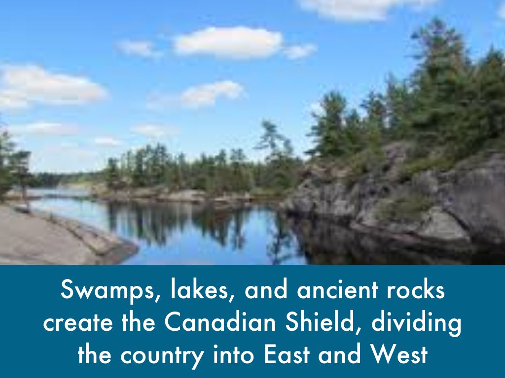 Swamps, lakes, and ancient rocks create the Canadian Shield, dividing the country into East and West