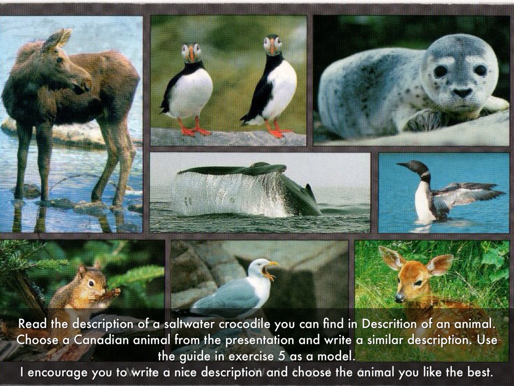 Read the description of a saltwater crocodile you can find in Descrition of an animal. Choose a Canadian animal from the presentation and write a similar description. Use the guide in exercise 5 as a model. I encourage you to write a nice description and choose the animal you like the best.