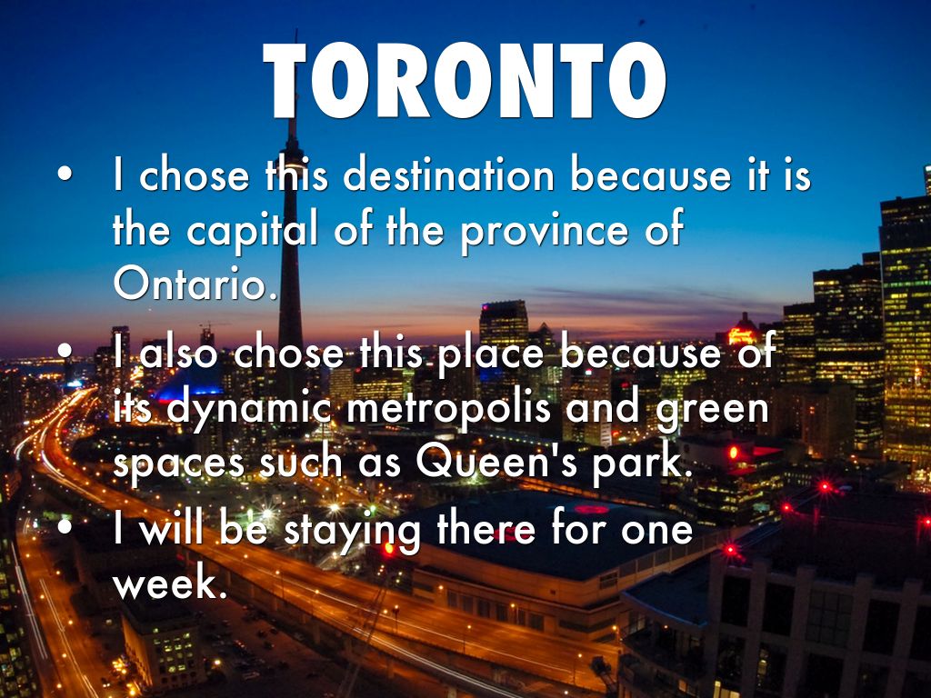 I chose this destination because it is the capital of the province of Ontario.