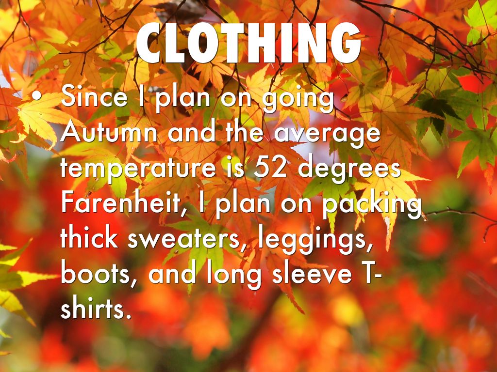 Since I plan on going Autumn and the average temperature is 52 degrees Farenheit, I plan on packing thick sweaters, leggings, boots, and long sleeve T-shirts.