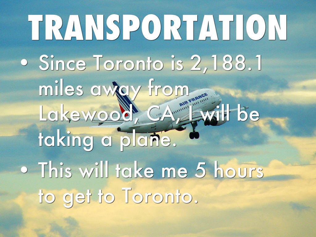 Since Toronto is 2,188.1 miles away from Lakewood, CA, I will be taking a plane.