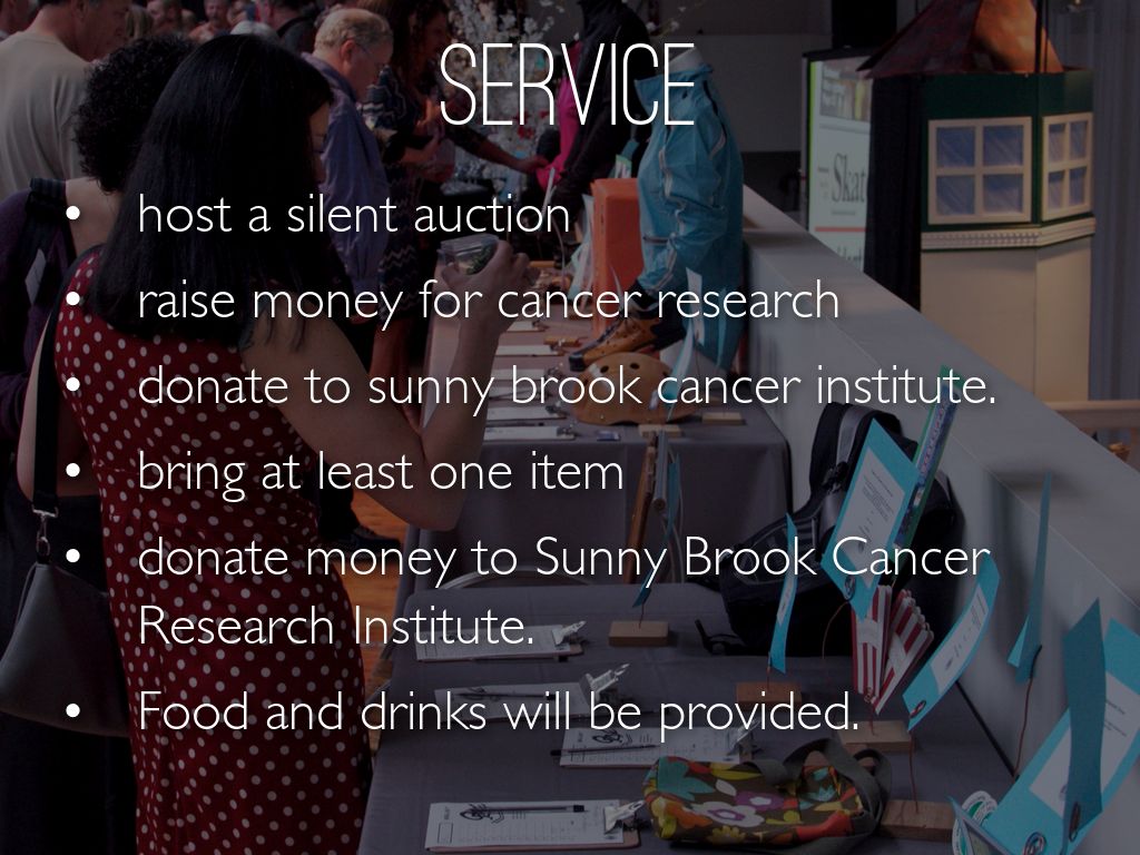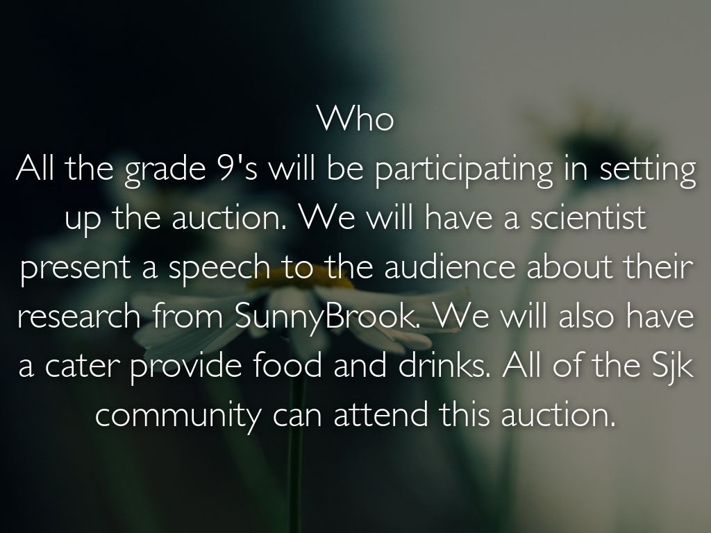 Who All the grade 9's will be participating in setting up the auction. We will have a scientist present a speech to the audience about their research from SunnyBrook. We will also have a cater provide food and drinks. All of the Sjk community can attend this auction.