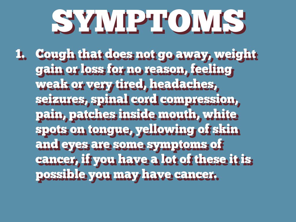 Cough that does not go away, weight gain or loss for no reason, feeling weak or very tired, headaches, seizures, spinal cord compression, pain, patches inside mouth, white spots on tongue, yellowing of skin and eyes are some symptoms of cancer, if you have a lot of these it is possible you may have cancer.