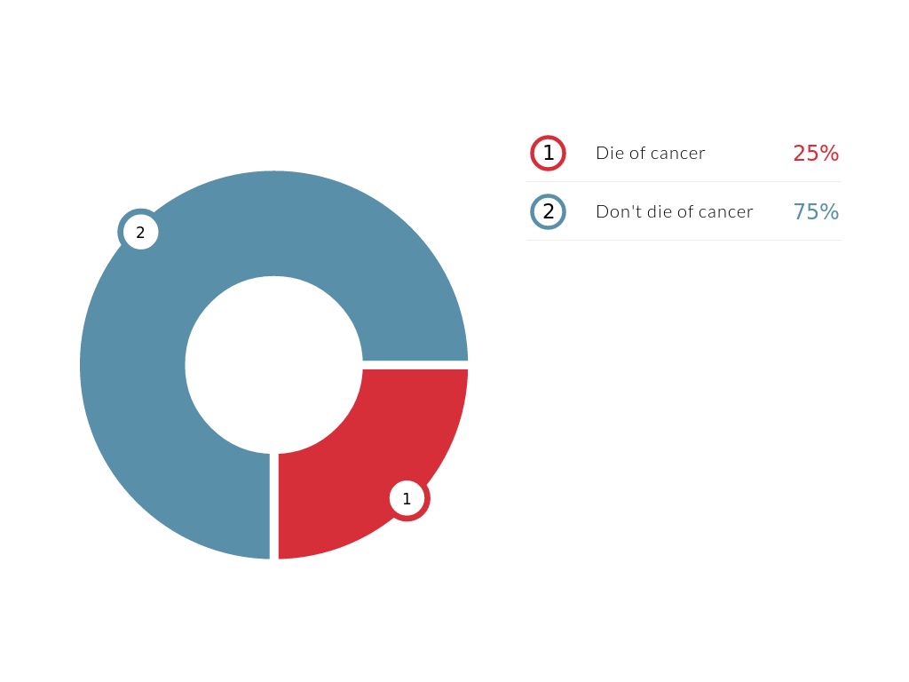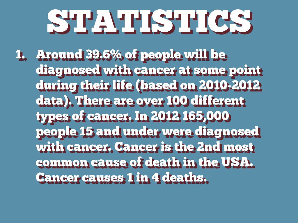 Around 39.6% of people will be diagnosed with cancer at some point during their life (based on 2010-2012 data). There are over 100 different types of cancer. In 2012 165,000 people 15 and under were diagnosed with cancer. Cancer is the 2nd most common cause of death in the USA. Cancer causes 1 in 4 deaths.