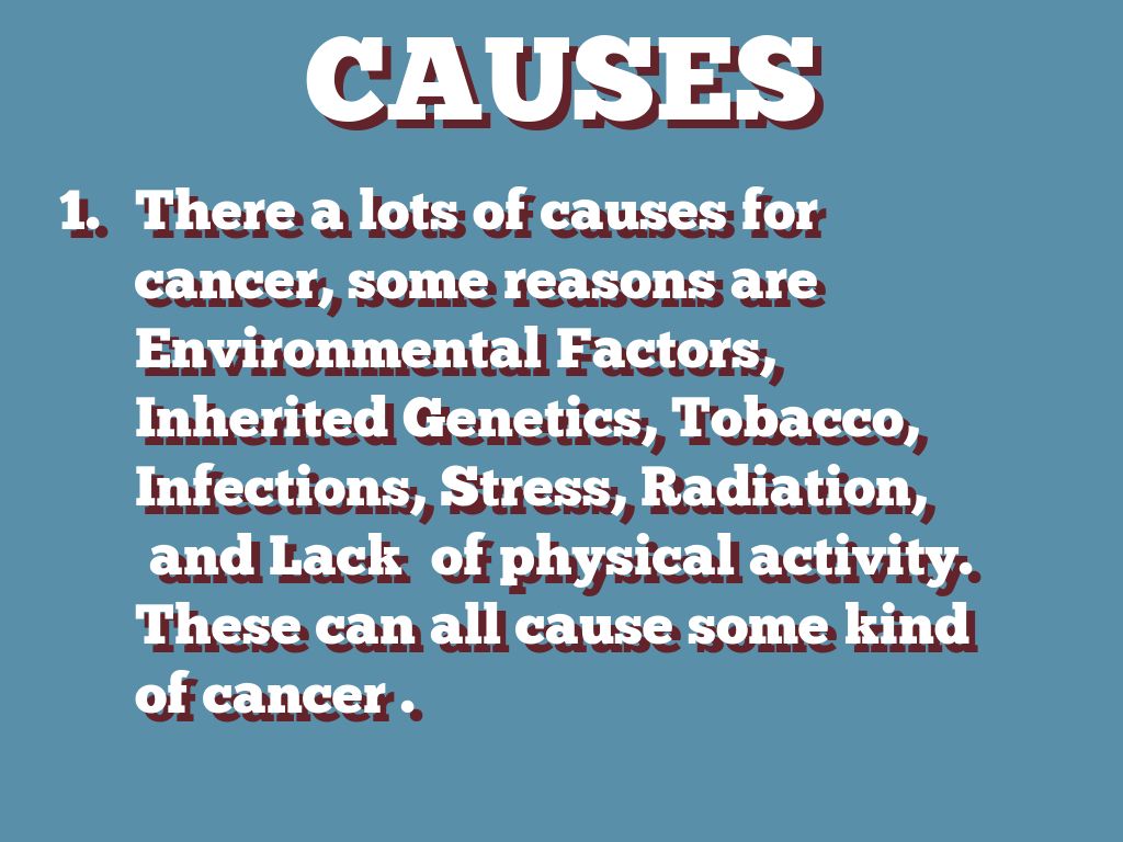 There a lots of causes for cancer, some reasons are Environmental Factors, Inherited Genetics, Tobacco, Infections, Stress, Radiation, and Lack of physical activity. These can all cause some kind of cancer .