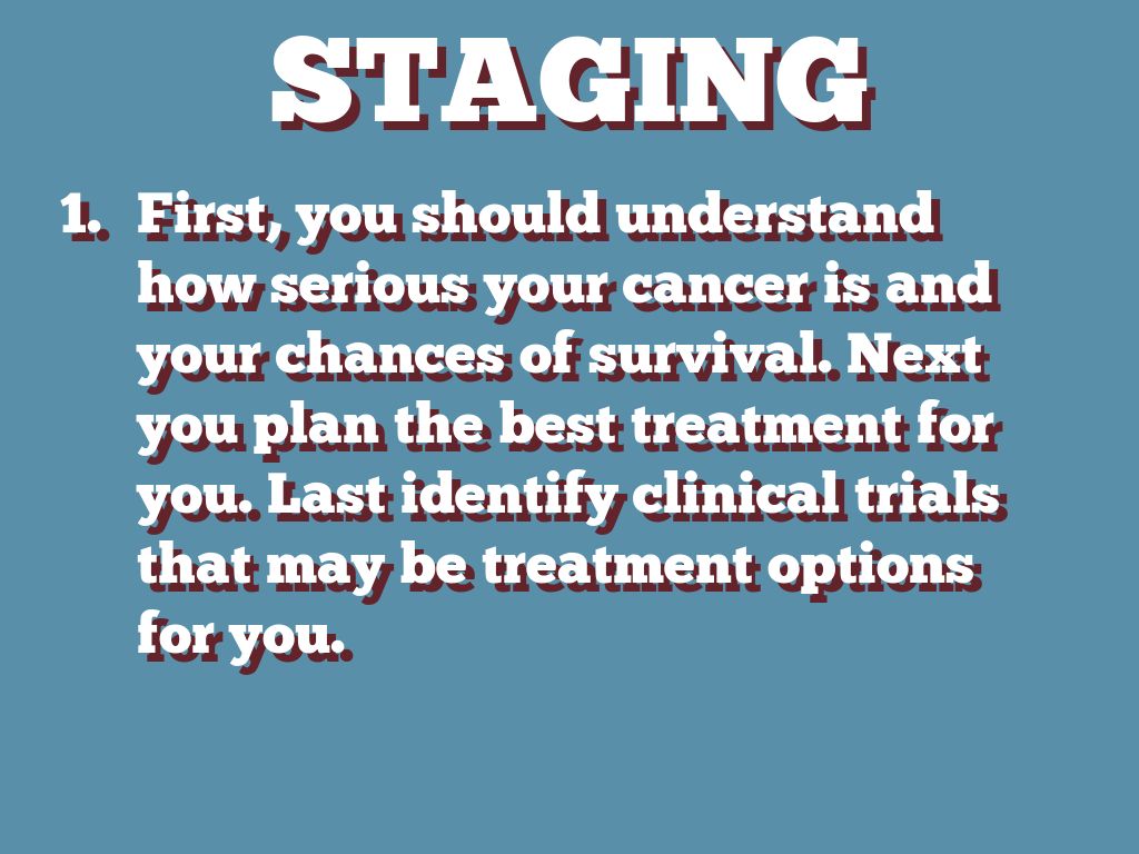 First, you should understand how serious your cancer is and your chances of survival. Next you plan the best treatment for you. Last identify clinical trials that may be treatment options for you.